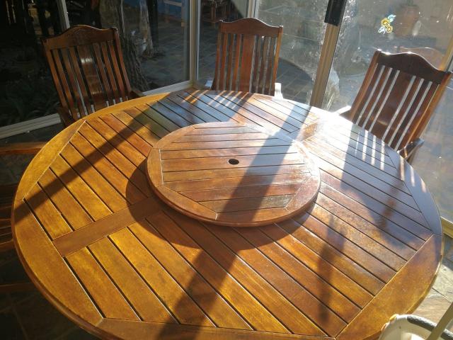 Solid, wooden, patio set. Includes table with lazy Suzan and 8 chairs.