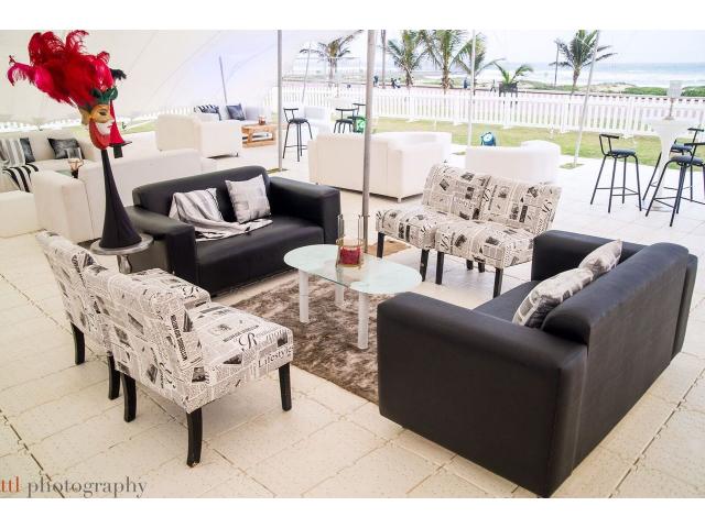 We have a wide range of White Frame Tents, Clear Frame Tents, Tents with Glass Panels and Doors, Stretch Tents, Designer Chairs and Tables, Decor for all type of events, Cutlery and Crockery, Linen, White Interlocking Flooring, Wooden Flooring with carpeting, AstroTurf, Lounge Set Ups, Cocktail Set Ups, Air-conditioning, Draping, Ablution Services, Security Fencing, Picket Fencing, Stages, Dance floors, etc