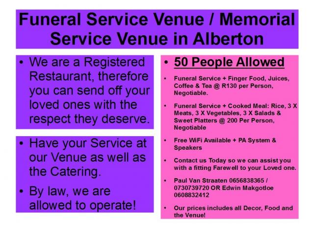 Funeral Service + Finger Food, Juices, Coffee & Tea @ R130 per Person, Negotiable.